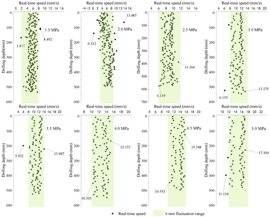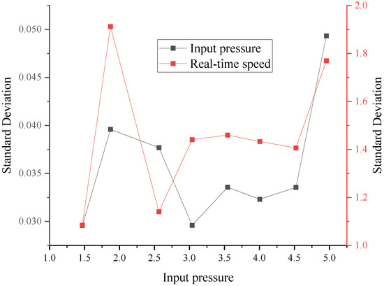 For the analysis of the test results in parameters calibration, drilling speeds with different input pressures of hydraulic motor conditions are discussed. The results of the drilling speeds are shown in Figure 10. It can be seen that the real-time drilling speed maintains oscillation stability, and it oscillates mainly in a range of 6 mm/s for different input pressures. In addition, the real-time speed was increased by increasing the input pressure. Figure 10 also shows that, under the action of the higher-value input pressure, the distribution of the real-time drilling speed becomes dispersed. In this paper, the standard deviation is used to characterize the degree of dispersion of the input pressure and real-time drilling speed, as shown in Figure 11. The results show that the dispersion of the input pressure is small, and it proves the drilling rig can provide a stable fluid pressure. As the input pressure increases, the standard deviation of real-time speed rises. Therefore, with the increase in the input pressure, the real-time speed becomes relatively unstable, which may be due to the damage to the internal parts of the hydraulic motor. However, it does not affect the stability of the drilling process.