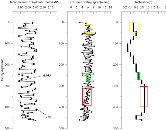 In order to improve the applicability of this rig in field applications, based on the obvious response in the test, it suggests that the drilling speed should firstly be maintained at 6 mm/s (low-speed stage) for a long period of time. The reason is that during the medium- and high-speed drilling stages, drilling speeds become relatively dispersed, and the fluctuations of drilling speed occur more frequently. For the drilling trajectory in the field, the law of change can be determined according to the real-time drilling speed; when the real-time drilling speed remains constant for a long time, it means that the drilling inclination remains relatively stable to achieve a more accurate direct push drilling process. Therefore, the reasonable selection for the direct push drilling speed is important in the field of direct push drilling. As well as with the duration of the drilling depth, the drilling speed may have a tendency to become smaller. The technical parameters can be optimized by adjusting the input pressure of the hydraulic motor in the process of implementing direct push drilling. The drilling speed and inclination angle evolution in the drilling’s different stages can be obtained from the tests, which can provide the theory support for optimizing the parameters of direct push drilling operation in the field.