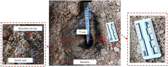 Based on the results in Section 5.1, the input pressure of the hydraulic motor in this test is 2.000 MPa. However, as shown in Figure 13, the input pressure fluctuates between 1.935 MPa and 2.060 MPa, but its average value is 2.000 MPa. Under the action of this working pressure, the drilling distance is 462.461 mm, the drilling time is 87.545 s, and the average drilling speed is 5.283 mm/s. The average drilling speed is lower than the speed calculated by Equation (2), but the real-time drilling speed is more stable. Therefore, the correction of Equation (2) needs to be performed in future work based on multiple drilling tests in different soil layers. As shown in Figure 13, the inclinations of the drilling tool present step shape fluctuations, and they vary from 0.3° to 0.9°. The phases in which the inclinations remain constant correspond to the phases in which the real-time drilling speed remains relatively stable, which shows that large fluctuations in real-time speed can affect the stability of the drilling tool. Therefore, real-time drilling speed needs to be kept stable to obtain accurate data during the contaminated sites investigation. The drilling effect is shown in Figure 14. It can be seen that the C-DP drilling rig can provide a good hole formation effect and remain stable in the drilling operation.