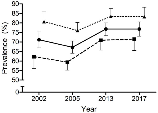 Physical inactivity levels of European Adolescents (boys, girls, and whole sample) in the four studied time points. Levels (%) of physical inactivity (reporting <60 min/day of moderate to vigorous physical activity on average) among European Union Adolescents (in circles, the whole sample; in triangles, the girls’ sample; and in squares, the boys’ sample) for four different time points (2002, 2005, 2013, and 2017). Data are means ± CI.