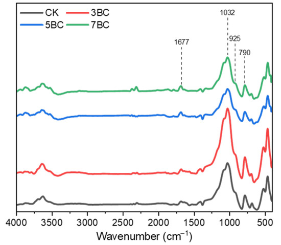 The results of soil infrared spectroscopy with different biochar amendments (Figure 2) showed that the chemical functional group composition of the soil with biochar and the soil without biochar was basically similar, but the peak intensities of these characteristic peaks were different. According to previous studies, the peak at 790 cm−1 was attributed to the C-H bending vibration of the benzene ring; the peak at 925 cm−1 was attributed to the basic vibration peak of illite; the peak at 1032 cm−1 was attributed to the C-O stretching of polysaccharides, alcohols and phenols vibration; and the 1677 cm−1 was attributed to the aromatic C=C stretching vibration [51,52]. Compared with CK, the absorption peak intensity of 5BC and 7BC at 1677 cm−1 increased slightly, and the absorption peak height of 3BC was basically similar to that of CK. On the contrary, the absorption peak intensity at 1032 cm−1 was slightly decreased for 5BC and 7BC, but increased significantly for 3BC. In addition, 3BC also significantly improved the absorption peak intensity at 790 cm−1. This result suggests that differences in the functional groups of soil organic matter are associated with the properties of biochar prepared at different pyrolysis temperatures.