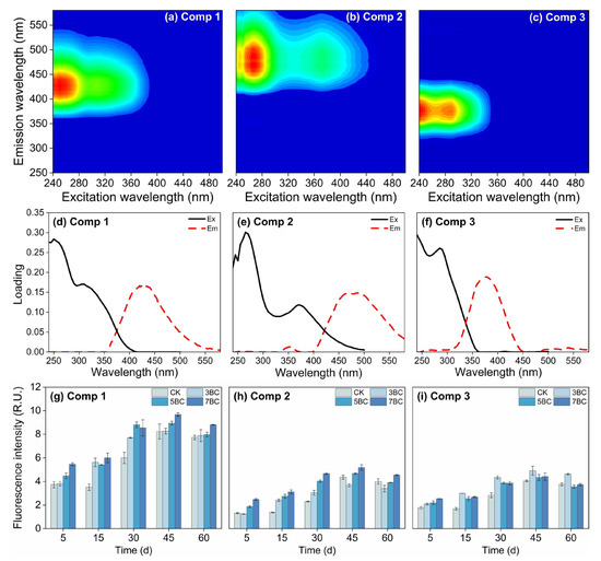 Three fluorescent components (C1: humic-like component enriched with fulvic acids, (a); C2: humic-like component, (b); C3: protein-like component, (c)) and corresponding excitation/emission loads (d–f) in biochar-treated soils as determined by EEM-PARAFAC analysis, and the fluorescence intensity (g–i) of the components during incubation. Data are presented as mean ± standard deviation (SD), n = 3. CK, control; 3BC, 300 °C biochar treatment; 5BC, 500 °C biochar treatment; 7BC, 700 °C biochar treatment.