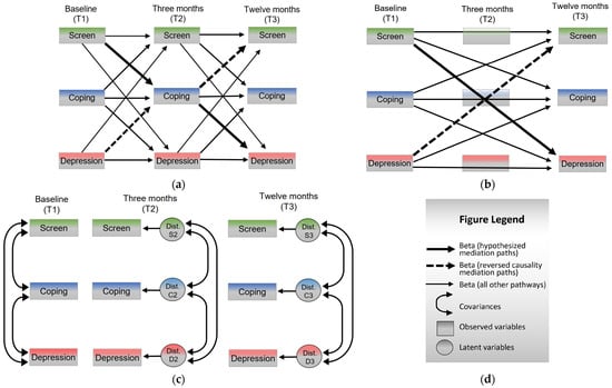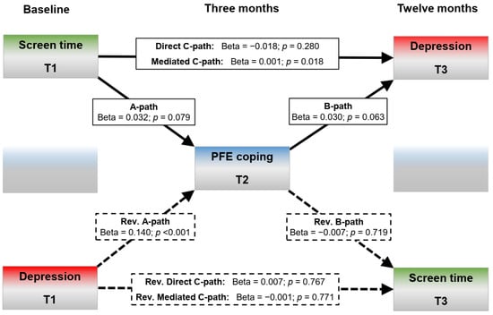 The post hoc test was primarily used to determine whether the observed interaction effect was a mediation effect. Since the GEE analysis showed that the time × screen time × PFE interaction was significant when adjusted for all other effects (gender, socioeconomic status, EFE coping), the post hoc model was unadjusted. Instead, the structural regression model aimed at disentangling the pathways through which screen time at T1 predicted depressive symptoms at T3 (and vice versa). Whereas the analysis output encompassed a total of 57 estimates (variances/covariances, direct, indirect and total effects; all reported in detail in Appendix A; Table A3, Table A4 and Table A5), only the ones related to the longitudinal PFE coping mediation are illustrated in Figure 3 and discussed further.