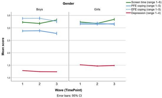 Descriptive statistics for screen time, PFE coping, EFE coping and depressive symptoms are shown in Figure 2 below, separately for the two genders and the three waves of data collection. The 95% confidence intervals around these estimates can be used to draw some important inferences. For example, girls reported more depressive symptoms than boys, and both genders had decreasing symptoms over time. The average depression score in the sample was M = 1.38 (SD = 0.39; pooled M = 1.35; pooled standard error, SEM = 0.003). This mean corresponds to 7.98 BDI-II scores. Another finding was that boys engaged more in PFE coping than EFE coping, while girls engaged in both coping behaviors to the same extent. Both genders had approximately the same screen time scores (the mean response corresponds to 3–4 h of daily leisure screen time). Screen time scores also increased during the course of the study, especially during the last nine months. Perceived socioeconomic status was only measured at baseline (not shown in Figure 2), and a descriptive analysis showed that most participants reported having enough money to do the same things as their friends/peers (Never = 1%; Seldom = 3%; Sometimes = 8%; Often = 22%; Always = 66%).