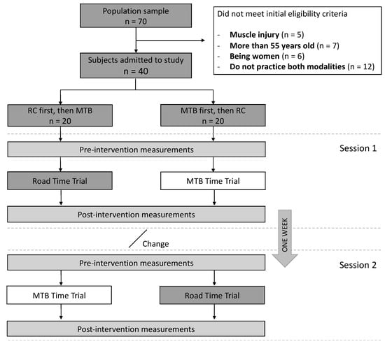 Forty (n = 40) amateur males (aged 34.8 ± 8 years, body height 164.7 ± 42.9 cm, body mass 74.4 ± 8.9 kg, HR rest of 60.2 ± 9.3) from mixed cycling modalities, RC and MTB, were evaluated under two different intervention conditions: RC and MTB time trial (TT). They had a training experience of 6.9 ± 5.5 years in RC and 11.6 ± 7.3 years in MTB; and an average volume of training during the last four weeks of 4:41 ± 4:17 h:minutes (h:min) in RC and 2:41 ± 3:03 h:min in MTB.