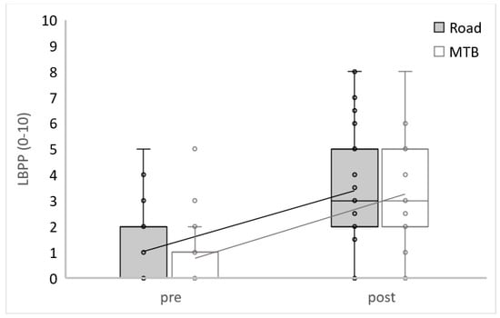 This study aimed to describe and analyze the evolution of LBPP in recreational cyclists who practice road and mountain biking. Increased detected LBBP was greater than 2 points, which is considered clinically relevant [], both in RC and MTB. This finding agrees with previous results showing that LBP is one of the main consequences of cycling practice [,]. However, in their work, during which they collected this value only at the end, Srinivasan et al., 2007 [] described a mean of LBPP of 6.8 ± 0.63 in a group with previous LBP after carrying out a 30-min outdoor RC TT and 4.4 ± 0.65 in the control group (without previous LBP). In line with our results, a single case study on a subject with previous LBP [] observed an increase of LBPP to 7 during a 2 h outdoor cycling task. Furthermore, Van Hoof et al., 2012 [], described a significant increase in LBPP in a group of amateur cyclists with previous LBP (n = 8) after completing a 2-h bicycle ride at a submaximal intensity (60–70% intensity). However, they did not observe any change in the group without pain (n = 9). Although the fact of having experienced LBP previously is considered a risk factor associated with suffering LBP [], pain perception in cycling is also associated with many other factors such as a ride to work, core training, cycling experience, saddle discomfort, and pain while not cycling [].