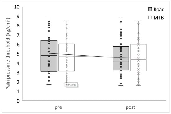 Regarding PPT, participants reported a decrease after completing the TT, but this change was statistically significant only for the RC condition. Although the difference in MTB was not statistically significant, the trend is like RC, which, besides the ES found, indicates a change in the response pattern. Since cyclists seem to be acclimatized to some degree of discomfort even in healthy conditions, so they continue to participate regardless of pain [,], these perception variables can be important in the context of coaching, because cycling practices that are painful and uncomfortable could result, not only in reduced performance, but also in injury []. Further studies are recommended to assess the relationship between bike fitting for comfort relative to LBPP.