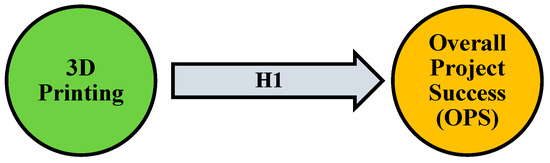 The overall success of a project is dependent on five important aspects, including cost, time, quality, environment, and safety precautions. If these five conditions are met, every construction project may be deemed a success; hence, the OPS is based on effective time management, regulated cash flow, quality assurance, environmental preservation, and public safety [37,87,91]. It is because of the fact that the construction project’s success should provide benefit to society, the environment, and the economy [44,90,91]. It has been investigated whether or not 3D printing may be used to expedite mundane but necessary building operations. Before declaring the endeavour a success, however, it was necessary to weigh the numerous implications of 3D printing. Three-dimensional printing’s application to the building trades will determine the project’s ultimate success. E. Ali, Korolev et al. and Tan [16,25,26] conclude that advancements in 3D printing of buildings will allow for a higher probability of success in the long run. These days, projects are more complex and need novel approaches that use the synergy of those involved to ensure the project’s success. Elfatah, Lee et al. and Marchment et al. [28,29,31] stated that conflicts may be avoided and participants’ expectations for the project’s success can be bolstered by using 3D printing in construction to resolve and manage their future concerns. According to El-Sayegh et al., Florea et al. and Hossain et al. [36,41,77], in terms of overall project success and project completion, the impact of 3D construction printing on employees and businesses is different from what has been witnessed in the literature thus far. OPS becomes therefore certain when any construction project does not result in any causing injury to workers, increased cost than planned budget, impacted the timeline, reduced quality, and affected the environment. This research is significant because it will contribute to our understanding of 3D building printing and its impact on OPS by shedding light on how these technologies are really put to use. To the best of our knowledge, this is also one of the first empirical studies performed in Malaysia. In this study, 3D printing is an independent variable and OPS is an independent variable. The main hypothesis is, H1: There is a significant relationship between 3D printing and OPS. The paper goes into depth on the impact that different 3D printing methods had on OPS in the Malaysian manufacturing industry, including the planning and implementation stages. The value of a study is shown when it provides theoretical insight into the phenomena being examined, in this case, 3D building printing in a new nationwide environment. The hypothesis of this study relative to the connection between 3D construction printing and residential OPS is given in Figure 1.