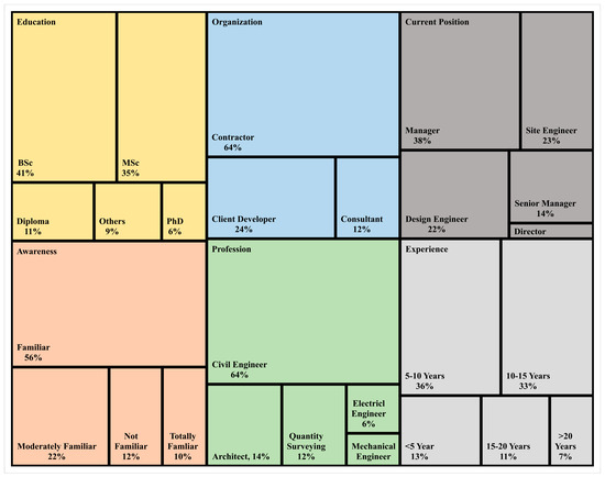 The demographic profile of the participants involved in the study is shown in Figure 3. From an education perspective, 11% had a diploma, 41% had a bachelor’s degree, 35% had a master’s degree, 6% had a PhD, and the remaining 9% had other types of education. From an organisation perspective, there were 64% contractors, 12% consultants, and 24% client developers. From a current working position perspective, 35% were managers, 22% were design engineers, 23% were site engineers, 14% were senior managers, and only 3% were directors. It is observed that 12% of respondents were not familiar, 56% were familiar, 22% were moderately familiar, and only 10% were totally familiar with 3D printing technology in the construction industry. From a profession perspective, 64% were civil engineers, 14% were architects, 12 were quantity surveyors, 6% were electrical engineers, and only 4% were mechanical engineers. From an experience perspective, 13% of participants had less than 5 years, 36% had 5 to 10 years, 33% had 10 to 15 years, 11% had 15 to 20 years, and 7% had greater than 20 years of experience.