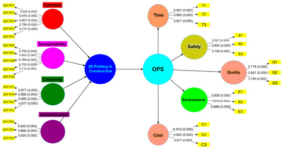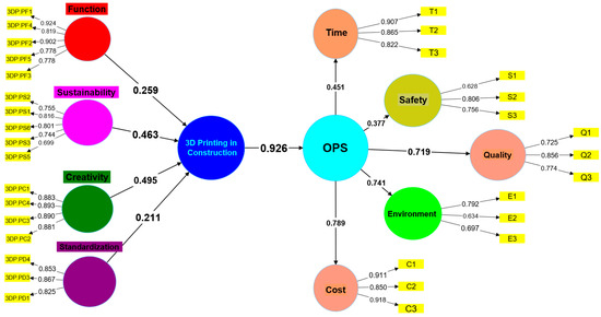 To verify the links between 3D printing and OPS (cost, time, quality, public health safety, and environmental protection) in Malaysian home construction, a PLS-SEM study was conducted. Specialists in the building trade provided the evidence necessary to verify the direct and indirect channels as essential to the structural model. Furthermore, both direct and indirect correlations between activity components and covariates were confirmed. Based on the findings, 3D printing may be used to save costs and boost the success rate of any project.