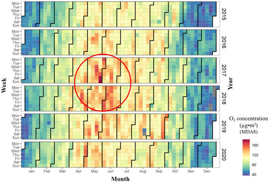 The heat map of urban O3 concentration (MDA8) in mainland China from the year of 2015 to 2020. (The “grey” colour in Figure 1 represents the days when there were less than 14 valid MDA8 data and the MDA8 value did not exceed the limit value criteria between 08:00 and 24:00. Missing dates are 22–26 December 2018).