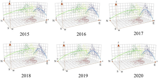 The trend analysis tool was used to perform a three-dimensional perspective analysis based on the urban O3 concentration and geographic spatial coordinate projection of mainland China (Figure 2). In the east-west direction (shown by the green line in Figure 2), the best-fit trendline of the urban O3 concentration presented a “J-shaped” curve, where the urban O3 concentration showed a trend of low in the west and high in the east. In the north-south direction (blue line in Figure 2), the best-fit curve presented an “inverted U-shaped” curve, where the urban O3 concentration in the mid-latitude regions of mainland China was higher than that in the low- and high-latitude regions. From a national perspective, the overlapping regions of the eastern coastal and mid-latitude regions (N30°~N40°) of mainland China were the key areas of urban O3 pollution from 2015 to 2020.