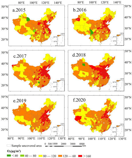 Based on the data of urban monitoring points, the detailed spatial distribution characteristics of the urban O3 concentration are plotted in Figure 3. From 2015 to 2016, the urban O3 concentration pollution area exhibited a spot-like distribution, mainly concentrated in the Beijing-Tianjin-Hebei region, Shandong Peninsula, and the Yangtze River Delta region (Figure 3a,b). However, by 2018, the polluted area expanded from a spot-like shape to a surface-like shape. The areas of high O3 concentration included most cities in North China, East China, and Central China, and even cities in Southwest China were also polluted by O3 (Figure 3c,d). From 2018 to 2020, the area of O3 pollution was significantly reduced, and it was confined to North China and a small part of the Yangtze River Delta (Figure 3e,f). For instance, since 2017, the near-ground O3 concentration in the Yangtze River Delta region has shown a downward trend, which was due to the concentrations of O3 precursors (NOx and VOCs) emitted in 2017, which were at their peak during this time period. High concentrations of NOx and VOCs directly contribute to elevated urban O3 concentrations [39]. The results showed that although the concentration of O3 in cities from mainland China has been at a high level, the degree and area of pollution are decreasing. The obvious regional aggregation characteristics of urban O3 pollution can also be found in Figure 3. The core areas of pollution were mainly concentrated in the North China Plain and the Yangtze River Delta. From 2015 to 2018, the expansion of the O3 pollution area in cities in China was affected by the reduction of atmospheric particulate matter (PM2.5) and NOx emissions [40]. Studies revealed that the reduction of PM2.5 concentrations in the atmosphere slowed down the aerosol sink of hydroperoxyl-free radicals, thus promoting the production of O3 [41]. In addition, the increase in temperature and the decrease in humidity on the urban surface also exacerbated the increase in the urban O3 concentration [41]. From 2019 to 2020, the reduction in the extent of urban O3 pollution was due to the strengthened management and control of air pollutant emissions by the government and the impact of the COVID-19 epidemic [42,43].