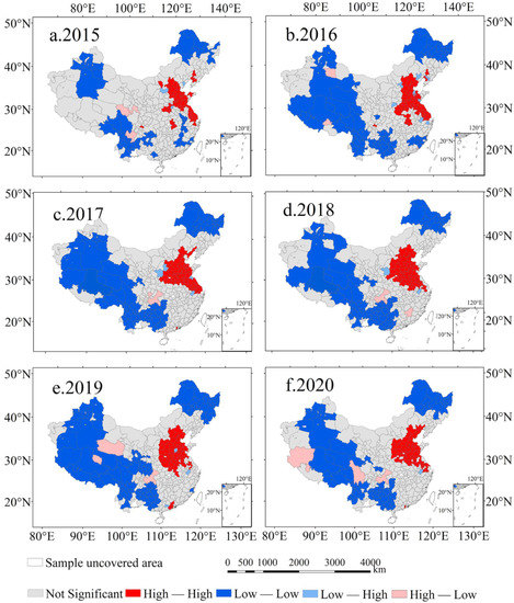 The spatial clustering pattern of the urban O3 concentration in mainland China from 2015 to 2020. (a) 2015; (b) 2016; (c) 2017; (d) 2018; (e) 2019; (f) 2020. (Note: Urban O3 concentrations are derived from the average values of the effective monitoring stations in each city).