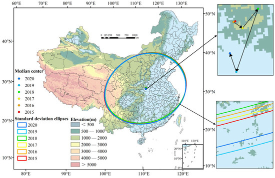 Time series of the mean center and standard deviational ellipse of the O3 concentration in mainland China in 2015–2020. (Note: Urban O3 concentrations are derived from the average values of the effective monitoring stations in each city).