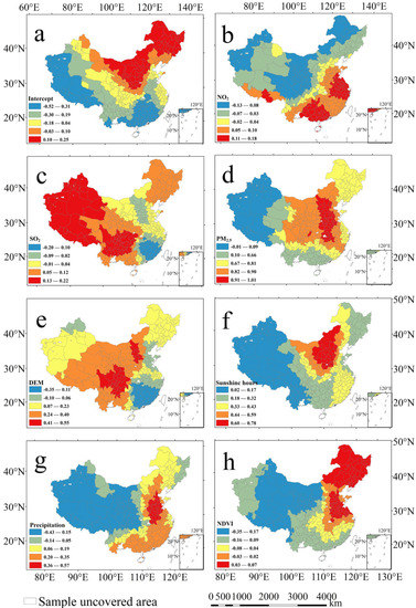 Spatial patterns of coefficients in the MGWR. (a) Intercept, (b) NO2, (c) SO2, (d) PM2.5, (e) DEM, (f) sunshine hours, (g) precipitation, (h) NDVI.