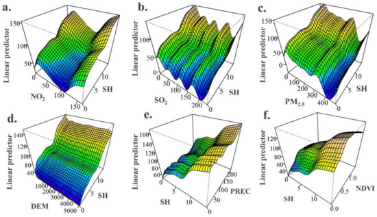 The variation of urban O3 concentration was the result of the compound action of multiple factors, rather than a simple single factor control [57]. To further explore the main driving factors of atmospheric pollutants and meteorological factors on the variation of urban ozone concentration on the Chinese mainland, NO2, SO2, PM2.5, DEM, SH, PREC and NDVI were selected as explanatory variables, and a GAM model under the interaction of multiple factors was constructed. Through pairwise combination, 21 groups of interaction terms were obtained. The results showed that these 21 groups of results all passed the significance test, and the effect on the change of ozone concentration was significant at the level of p < 0.01 (Table S5). In the model (GAM), the adjusted R2 was 0.609, and the maximum variance explanation rate was 60.9%, indicating that each interaction term has a good explanation degree for O3 concentration, and the model fitting effect reached the standard. In addition, the interaction F value of SH and PREC (5988.0), SH and NO2 (5673.7), SH and DEM (5567.8), SH and SO2 (5522.0), SH and PM2.5 (5462.2) was higher than that of other factors, and the interaction between SH and other factors significantly affected the variation of O3 concentration. Numerous studies have confirmed the significant contribution of sunshine hours to urban O3 concentration, mainly because sunshine hours affected the intensity of solar radiation (ultraviolet light) and the temperature of photochemical reactions [57,58]. However, the interaction of sunshine hours and other factors on the change of O3 requires further detailed analysis.