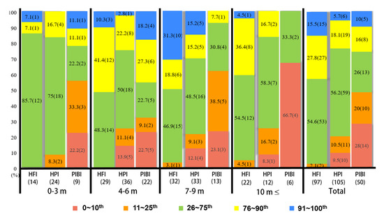 Distribution of five percentile categories of motor performance using the AIMS total score among three groups. HPI: healthy preterm infants, PIBI: preterm infants with brain injury, and HFI: healthy full-term infant. Age was calculated with corrected age or chronological age.