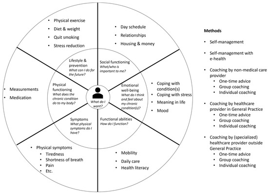 To reduce the burden of chronic diseases on patients and healthcare providers, single disease management programs (DMPs) have been developed [9,10,11]. Based on Dutch primary care [12,13,14], we define DMPs as long-term chronic care programs in primary care that are predominantly run by general practice nurses (PNs) under the responsibility of a general practitioner (GP) and focus on assessing, monitoring, and treating a single chronic disease. DMPs for chronic obstructive pulmonary disease (COPD), cardiovascular diseases (CVD), and diabetes mellitus type 2 (DM2) are currently the most widely implemented. Although DMPs have shown some minor improvements in process indicators, such as coordination of care and communication between caregivers [15,16], they have failed to show improvement in patients’ health-related quality of life (HRQoL) [17,18]. A possible explanation could be that DMPs mainly focus on the medical aspects of a specific condition, with less attention being paid to other chronic diseases or social problems that may also impact HRQoL. In addition, an organisation in which patients with multiple chronic diseases attend multiple DMPs provided by multiple healthcare professionals (HCP) is not desirable, both from an economical and patient perspective [19]. Patients may receive overlapping or conflicting treatment advice [20]. Furthermore, the DMP approach seems to conflict with the core competencies of primary care professionals, i.e., medical generalism, community orientation, focusing on social determinants of health and societal factors, and working from a personal–professional relationship with patients [21,22].
