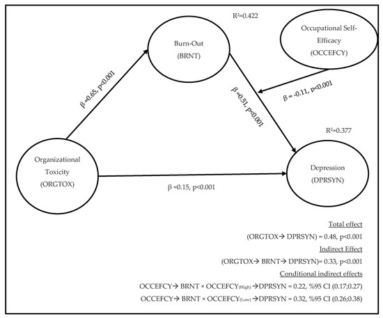 The final step was the examination of the moderating role of OCCEFCY in the indirect effect of OCCEFCY on DPRSYN through BRNT. According to the result in Table 8, the index of moderated mediation (β = −0.05, %95 CI [−0.09; −0.02]) was found to be statistically significant. These results show that the indirect effect of organizational toxicity differs by the occupational self-efficacy of employees. When employees’ perceived occupational self-efficacy is low, the indirect effect of organizational toxicity (β[OCCEFCY(High)] = 0.32, %95 CI (0.26; 0.38), β[OCCEFCY(Low)] = 0.22, %95 CI [0.17; 0.27]) on depression through burnout, increases. The results suggest that occupational self-efficacy buffers the effect of organizational toxicity on depression through burnout. Figure 2 provides details of the parameter estimates for the model. Therefore, Hypothesis 6 was supported as well.