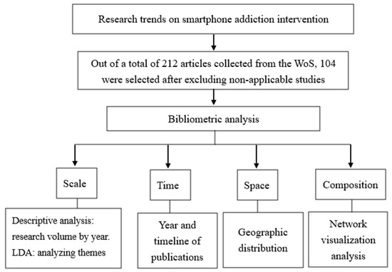 This study applied bibliometrics while adopting descriptive analysis, the LDA, and network visualization analysis as key analysis methods. The objective was to understand the trend of interventions for smartphone addiction by analyzing the concepts of scale, time, space, and composition. As shown in Figure 1, the workflow started by collecting journal articles from June to August 2022, excluding irrelevant and incompletely published studies, and performing bibliometric analyses.