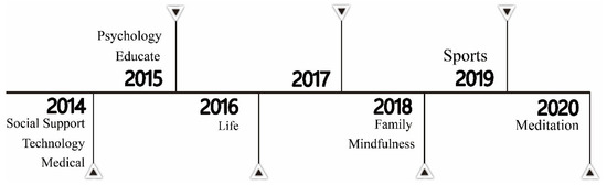 In this section, “time” refers to the development trajectory of publications in different time periods. As shown in Figure 3, the earliest studies on intervention programs—“technological intervention,” “social support,” and “medical intervention”—emerged in 2014, based on analyses and screenings. In 2021, the direction of research on social support intervention shifted toward social anxiety, advocating social networking and relationships to maintain well-being, thereby reducing problematic smartphone use [62].