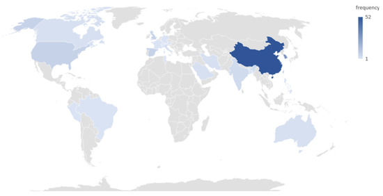 “Space” refers to the international geographical distribution of academic research. China had the highest research volume in terms of articles on smartphone addiction published in international academic journals, followed by South Korea, Taiwan, Spain, the UK, the US, India, Canada, Hong Kong, Iran, Australia, Italy, Saudi Arabia, the Caucasus region, France, the Hebrew region, Lebanon, Tunisia, the Philippines, Switzerland, Nigeria, Germany, Bangladesh, Oman, Sudan, Austria, Palestine, Vienna, Germany, Switzerland, Peru, and Brazil (Figure 4). Information on the spatial distribution showed that stronger attention was placed on the issue in the East Asian region. In addition to Spain, the non-Asian countries mentioned above are mostly English-speaking countries. This is also possibly because the journal database mainly comprises studies published in English.