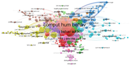 In this section, “composition” refers to understanding the structure of professional knowledge in a certain domain through exploring research topics and the types of relationships. Figure 5 illustrates the citation structure relationships among studies and indicates that the research of intervention programs for smartphone addiction is recognized by many academic journals and that they are interconnected in this field. Computers in Human Behavior has the highest number of citations. Similarly, the visualization shows that this journal has the strongest connections and mutual influence with other journals.