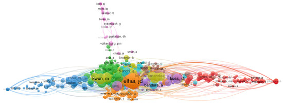 According to a VOSviewer analysis, the top-three researchers out of the 4935 in the total citations were the US clinical psychologist Jon D. Elhai, the Swiss experimental psychopathologist J. Billieux, and M. Kwon, who is a quantum optics scholar based in Boston (Table 5, Figure 6). The visualization analysis depicted in Figure 5 shows clusters around lead researchers in the field, indicating that their research has a high degree of association with others. The high concentration of researchers suggests cooperative relationships among multiple authors, as evidenced by the co-citations.
