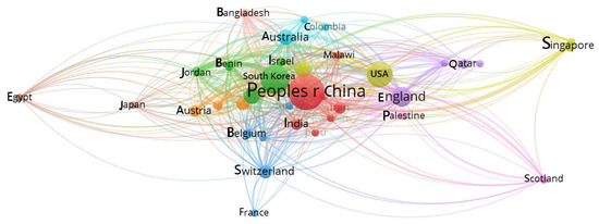 After analyzing 41 countries, China was found to have the highest number of citations in research on intervention programs for smartphone addiction, followed by South Korea, Taiwan, the US, the UK, Israel, Australia, Singapore, Spain, and Austria (Table 6). In Figure 7, denser dots and stronger connections indicate higher cooperation. China and South Korea not only showed high research capacity but also had highly influential and cooperative relationships.