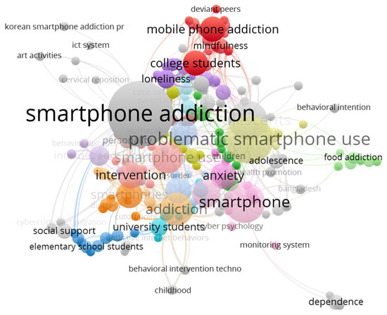 Figure 8 shows that certain keywords are intimately related to the intervention of smartphone addiction and represent related phenomena in that domain. Recently, researchers have proposed to replace “smartphone addiction” with “problematic smartphone use”. Most studies are related to mental health conditions such as depression and anxiety, and social media is also evidently related to smartphone addiction. Young people are the most common research subjects, and a few studies even suggest that an eating addiction among young people is related to smartphone addiction [74].