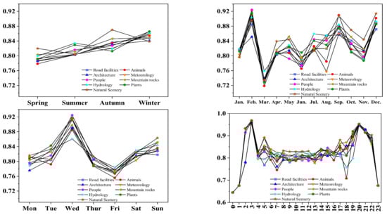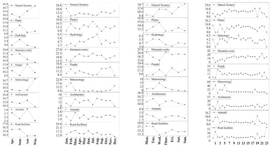 - In terms of the temporal divergence of landscape types of concern in tourists’ photos: ① From the seasonal scale, mountain rocks are the landscape type of concern for tourists throughout all seasons. In addition, in summer, visitors also pay attention to plant landscape types, and in winter, they pay attention to meteorology, natural scenery, and roads and facilities. The change in tourists’ emotional value on the seasonal scale is a “slowly sloping straight line” type, and tourists’ emotional value is highest in winter and lowest in spring. ② On the monthly scale, throughout all months, tourists focus on the mountain rock landscape type; in December–February, they focus on the meteorology landscape type; and in May–July, they focus on the plant landscape type. The change in tourists’ emotional value on the monthly scale is in the shape of a “W”, with the highest emotional value in February and the lowest emotional value in March. ③ On the weekly scale, the mountain rock landscape is the type that attracts attention seven days a week. The change in the emotional value of tourists on the weekly scale is the “N” type. ④ On an hourly scale, the meteorology landscape is the type that tourists mainly pay attention to from 03:00 to 06:00. The change of tourists’ emotional value varies on the hourly scale in the shape of “M”, with the highest emotional value at 03:00 and the lowest at 00:00.