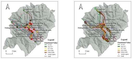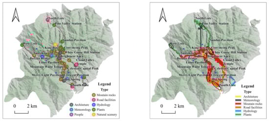 - The spatial differentiation of tourists’ visual landscape perceptions: ① From an overall perspective, the perception of hydrology and animals landscape images generally has the spatial characteristics of “scattered distribution”, and plants, architecture, and meteorology landscape perception images in general present “significant nucleus” spatial characteristics. The perceived images of mountain rocks, road facilities, natural scenery, and people display spatial distribution characteristics of “concentrated into a belt”. ② From the perspective of scenic spots, Stone From Heaven, Brightness Apex, Celestial Capital Peak, etc., belong to the photographic theme of rock images; Cloud Valley Temple Station, South Gate, North Gate, etc., belong to the theme of road and facilities images; King Pine, Convincing Peak, Black Tiger Pine, etc., belong to the theme of plant images; Mercy Light Temple, Cloud Valley Temple, Sea Heart Pavilion, etc., belong to the theme of architectural images. ③ The emotional value of North Gate, South Gate, Pine Valley Station, West Gate, and Mountain Waist Temple is less than 0.65, while the emotional value of Celestial Capital Peak, Dragon Fish Peak, Convincing Peak, and Greeting Pine is higher, namely between 0.65 and 0.85. A characteristic analysis of cumulative emotional value was conducted for the representative attractions recommended by the Huangshan Tourism Marketing Organization, namely Stone From Heaven, Brightness Apex, Greeting Pine, and Hot Spring, and it was found that the cumulative emotional value of Hot Spring is much lower than the other three attractions, which is inconsistent with the recommended results of the Huangshan Tourism Marketing Organization. Hot Spring is the first stop when entering the scenic area from the gate of Huangshan Mountain, and few tourists soak in Hot Spring first before climbing the mountain. In addition, Hot Spring needs to pay higher fees, which may lead to a low emotional accumulation value for tourists. Therefore, it is necessary to add cultural design and implement landscape improvements to Huangshan Hot Spring, improve the marketing strategy and service measures of Hot Spring, and provide reasonable promotion and guidance to tourists so as to enhance the tourism quality of Hot Spring.