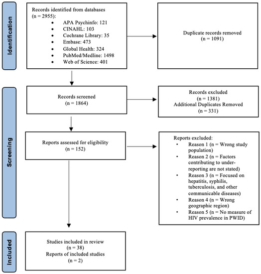 An initial search retrieved 2955 articles, with 1864 articles remaining after removing duplicates. Screening of title and abstract further excluded 1381 articles, with an additional 331 duplicates removed. In total, 152 full-text articles were assessed, of which 38 studies and 2 reports were extracted and included in the results. The screening, elimination process, and reason for excluding articles are outlined in the PRISMA chart (see Figure 1).