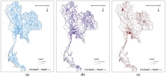There are three main road types in Thailand. First, arterial and highway roads refer to roads that connect provinces or districts. These usually consist of a large number of lanes focused on mobility, and they have heavy traffic volumes. In Thailand, these roads are maintained by the Department of Highways. Second, collector and distributor roads focus on connecting the highway to the district or to connecting districts with 2–4 traffic lanes and a low number of cars [8]. This group of roads is supervised by the Department of Rural Roads. Third, local roads focus on accessibility while entering the village. They may connect to both highways and distributor roads; thus, their traffic volume is low with a small number of traffic lanes, and there are large numbers of trucks in their traffic. Regarding the total length of roads, local roads are the longest road type, comprising approximately 86% of the total road length (Figure 1) [9].