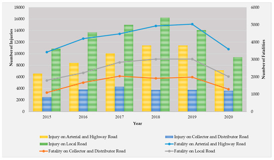 Number of Victims of Motorcycle Crashes among Road Types in Thailand in 2015–2020.