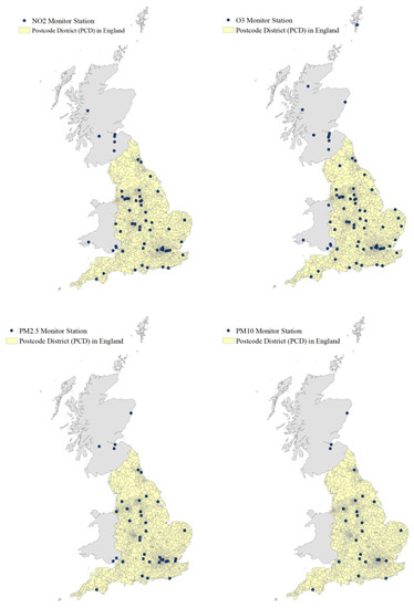 Figure 1. We included stations from Wales and Scotland to “borrow” measurements from monitoring stations, within 50 km of England. We produced air pollution surfaces at the PCD level to visually compare the spatial pattern generated from the two approaches (daily LUR and IDW). The comparison of the maps provides an insight into the spatial heterogeneity of the different methods. Greater spatial granularity enables the identification of hot spots of air pollution, which are often in densely populated areas (e.g., London, Birmingham) and, therefore, essential to assess the impact of air pollution on individuals.