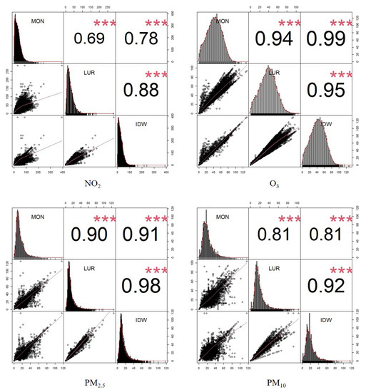 Section 4.2, we produced pairwise scatter plots that compare daily estimates against measurements recorded from monitoring stations. We used the Pearson correlation coefficient (Pearson’ r) to indicate the strength of the linear relationship between the two sets of data.