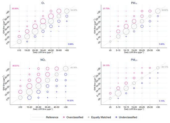 It could be argued that the conventional modelling approach in social sciences, by flexibly modelling air pollution impacts through the use of indicator bins, small deviations in concentrations from different air pollution exposure methods are unimportant should observations be properly classified into correct indicator bins. However, mismeasurement of an individual’s or unit’s air pollution exposure risks misclassification of individuals to indicator bins. To assess how the classification varies across the different methods, we compared any deviations between the assigned bins from daily LUR and the IDW for each observation by calculating the percentage of observations that did not fall into the same indicator bin category.