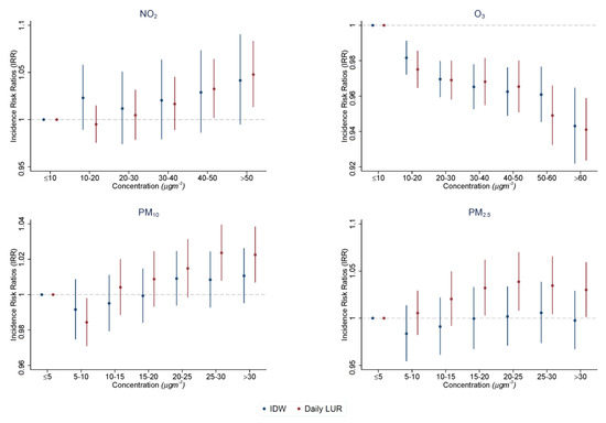 The difference in parameter estimates for the IDW approach and the daily LUR model was likely due to the inability of the IDW approach to account for different emission sources (such as road traffic, industrial activities) and topographies. We observed that, on average, air pollution concentrations derived from daily LUR showed smaller prediction errors than IDW and, thus, a higher accuracy. The instability of the IDW approach was also documented by [