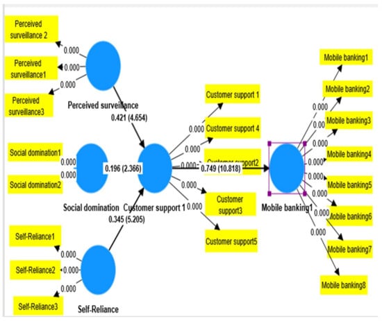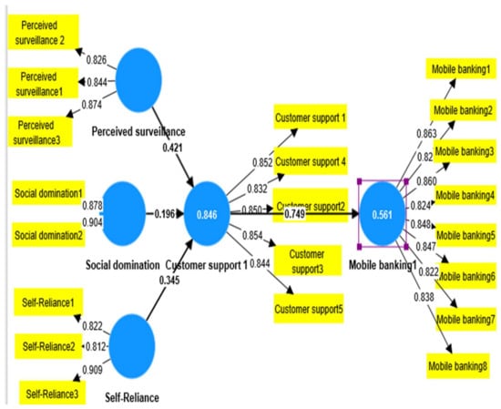 In Figure 1, perceived surveillance, self-reliance, social domination, and customer support and mobile banking are represented by circles since they are the latent constructs used by the researchers in the study [50]. Perceived surveillance was measured through three statements codes as perceived surveillance one to three, self-reliance was measured through three statements codes as self-reliance one to three, social domination was measured through two statements codes as social domination one to two, customer support was measured through five statements codes as customer support one to five, and mobile banking was represented through codes as mobile banking one to eight. The factor loading values are shown near the arrows pointing to the respective items/constructs [51]. The factor loading values are shown near the arrows pointing to the respective items/constructs. Regression value, also in Figure 1, shows the regression weight in the circle of the construct.