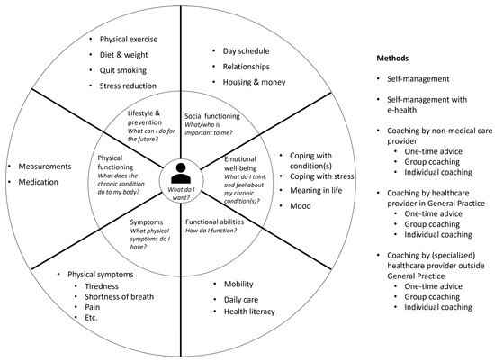 In the PC-IC programme, a holistic assessment of the health status is performed, personal goals are set, and interventions to achieve these goals are put in place [32,33]. The first step in this programme is assessing the integral health status of the patient (health across multiple domains—Figure 1), using a (preferably digital) questionnaire at home and physical measurements (i.e., blood pressure, weight, and glucose levels). The second step is an appointment in which the results are discussed with the patient in a semi-structured way. The case manager asks if the patient recognizes himself in the results of the assessment, if there are other issues that the patient would like to discuss, and the priorities of the patient. Personal goals are formulated in the third step, which can range from purely medical goals to social goals. In the fourth step, the healthcare provider and patient will together choose the right interventions to achieve these goals, based on the experience of the healthcare provider, the ideas of the patient, and a list of regional options. Different methods can be used to achieve these goals (i.e., through self-management, with e-health, with coaching from a non-medical care provider, with coaching from a healthcare provider within the GP practice, or with coaching from a healthcare provider outside the GP practice). The goals and interventions are documented in a personal healthcare plan, which is preferably digitally available to all relevant healthcare providers and the patient. Then, referrals are made if necessary, and the treatment is started. An evaluation is planned and carried out, if necessary multiple times. If a treatment goal is reached or another treatment goal is more urgent, the cycle can be repeated. The development of this PC-IC approach is described elsewhere in this issue [34].