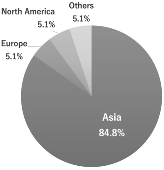 Region of origin of international university students in Japan. Note: Of the 231 university students under the age of 25, 79 were international students. Of these, 84.8% (n = 67) were from Asian countries, the highest percentage, followed by 5.1% (n = 4) from both North America and Europe.