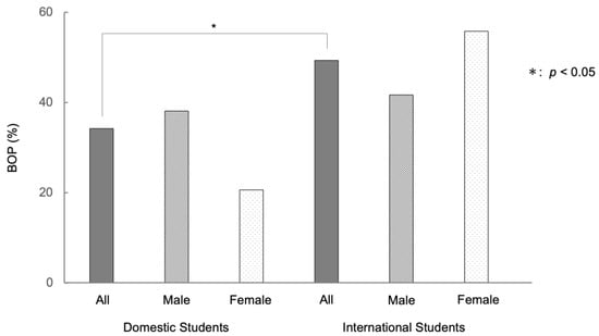 Differences of bleeding on probing (BOP) between international and domestic university students in Japan. Note: The international students showed higher percentage of BOP than domestic students (49.4% and 34.2%, respectively: p < 0.05).