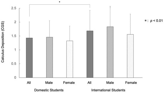 Differences of calculus deposition between international and domestic university students in Japan. Note: The mean CGS of international students (n = 79) was 1.68 and that of domestic students (n = 152) was 1.43. The international students showed more extensive calculus deposition (p < 0.01). Error bars denote the standard deviations of the data.