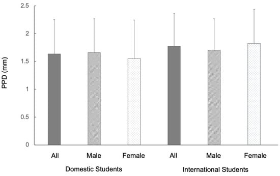 The mean PPD of the total university students (n = 231) was 1.68 mm. By gender, the mean PPD for males (n = 154) was 1.67 mm and for females (n = 77) was 1.70 mm, showing no significant difference. The mean PPD of international university students (n = 79) was 1.77 mm and that of domestic university students (n = 152) was 1.64 mm, showing no significant difference between the two groups. There was no gender difference in PPD for either international university students or domestic university students (Figure 4, Supplementary Table S1).