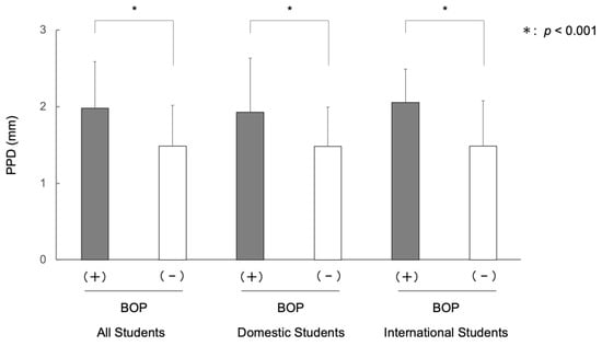 The mean PPD of the university students with BOP was 1.98 mm, and the mean PPD of the students without BOP was 1.49 mm, showing a large difference (p < 0.001). For international university students, the mean PPD for students with BOP was 2.05 mm, while the mean PPD for students without BOP was 1.49 mm. The mean PPD of international students with BOP was significantly larger than that of international students without BOP (p < 0.001). The mean PPD for domestic university students with BOP was 1.93 mm, and the mean PPD for domestic university students without BOP was 1.48 mm. The mean PPD of domestic students with BOP was significantly larger than that of domestic students without BOP (p < 0.001). Within the population that showed BOP, there was no significant difference in PPD between international and domestic students. Even among the population without BOP, there was no significant difference in PPD between international and domestic students (Figure 5, Supplementary Table S2).