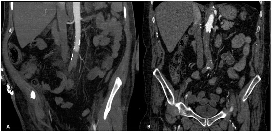Accurate diagnosis of PAO can be assessed by CTA, which is considered the first-choice imaging technique in emergency settings [21]. CTA allows for the direct anatomical visualization of the location of the occlusion, visualized as an endoluminal defect in the aortic lumen, and it allows the accurate assessment of concomitant occlusive disease affecting visceral arteries and the type and extent of collateralization, and supports an accurate surgical planning in the reaching of the affected vessel and the type of intervention to be carried out. CTA also provides insight into whether the thrombus is of recent onset, more hyperdense, or chronic, more hypodense (Figure 6A,B).