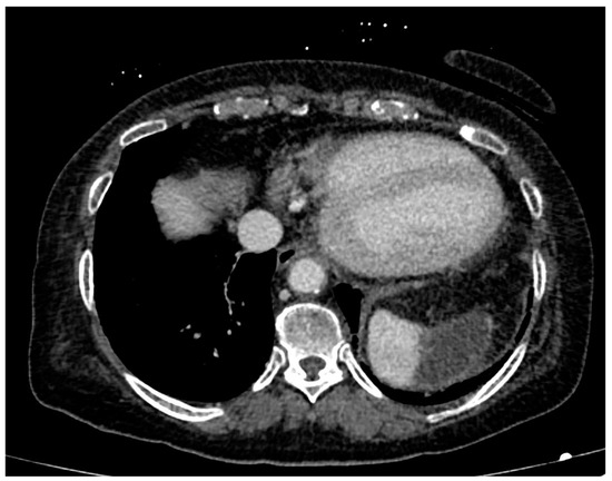 Figure 4. CT angiography, axial planes, portal phase. Focal ischemia of the splenic parenchyma may be noted in the upper anterior polar location. - -