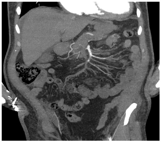 Figure 5. CT angiography, coronal planes, arterial phase, MIP reconstruction. Extended thrombosis in the superior mesenteric artery and its branches can be noted, with hypoperfusion of the intestinal loops.